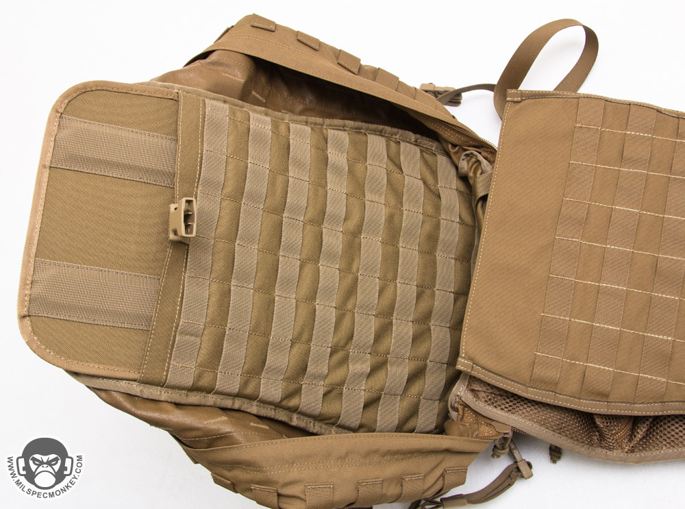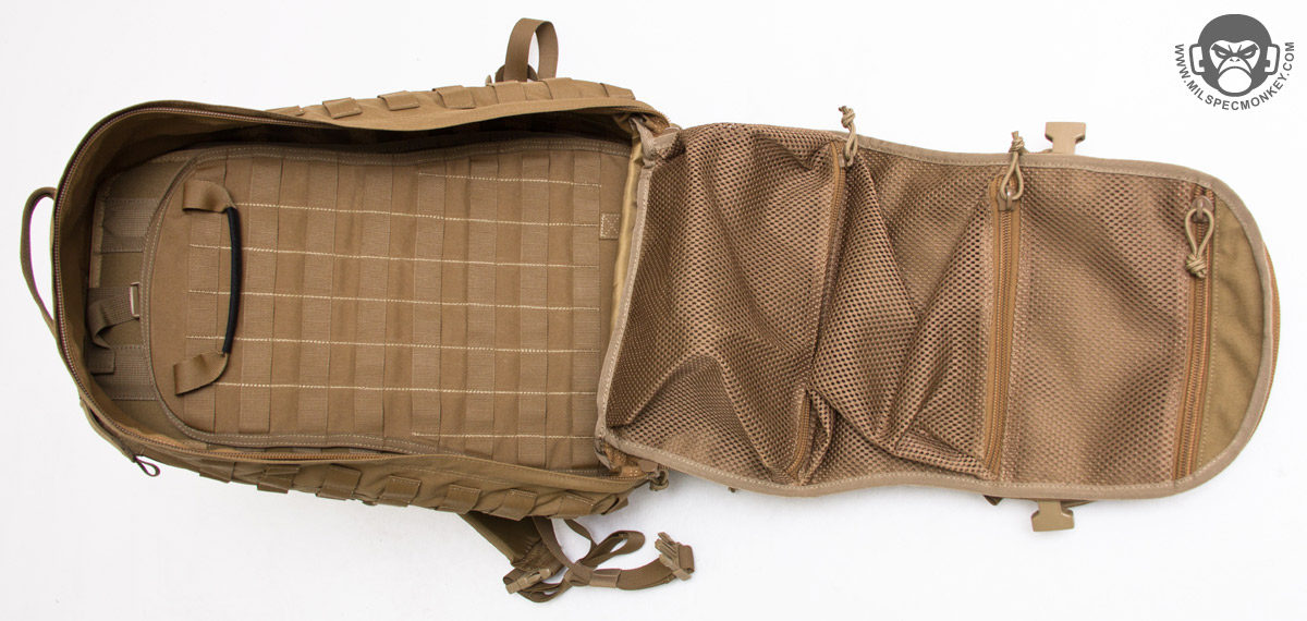 Onto the big show main compartment, it opens up with double zippers in a clam-shell style to offer full access. The exterior compression straps can be used to limit this effect if desired. With the larger size, 3 mesh zipper pockets are on the front interior with the top one being overall slim while the lower two have some baggyness to them. These are great for general organization for gear such as medical items. Over to the back side is hydration pocket zone that has an SRB closure now with the whole sleeve covered in PALS webbing. The PALS offers the same great modularity that is on the outside to interior needs. Since the back area is padded, one could alternatively store a small laptop / tablet back there. Additionally up top is the center hole covered by elastic and then 2 more ports with velcro flaps on the sides to offer access to any sort of hydration tube or antenna needs.