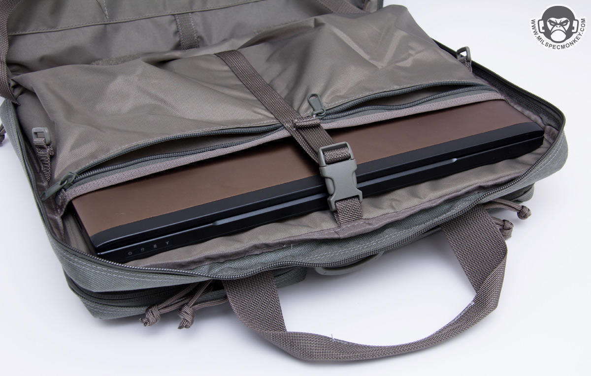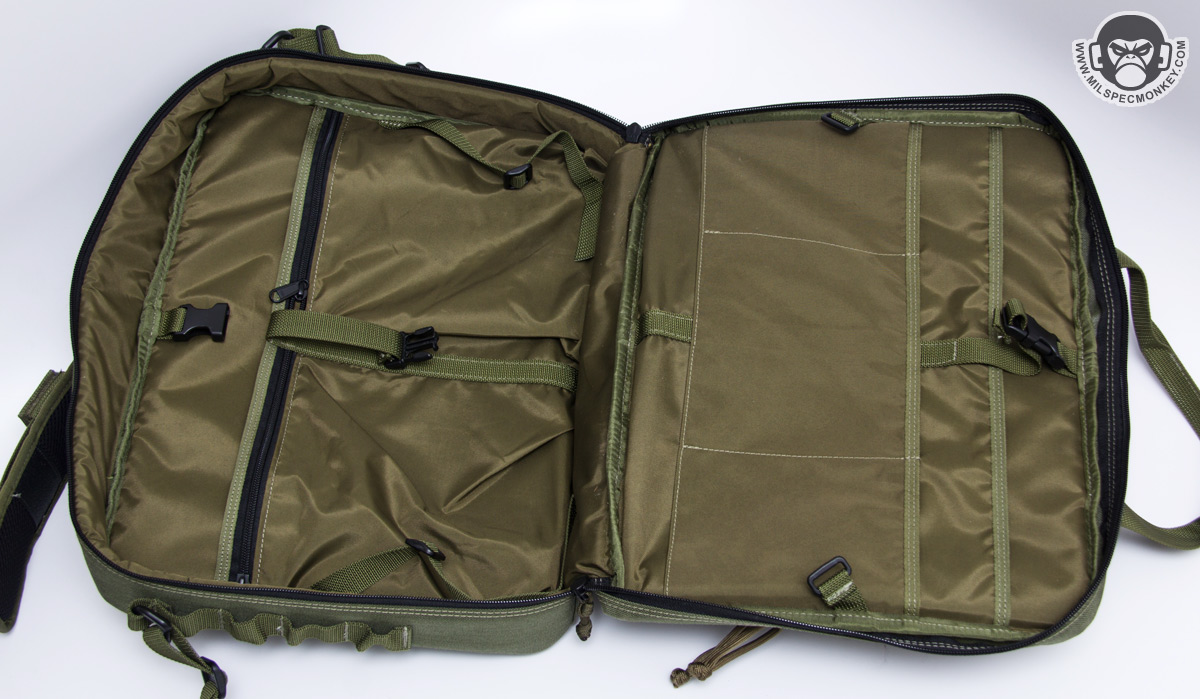 While already on the subject of the main interior I suppose we might as well follow through. As a handy feature, the double zippers open up to a full clam shell style which then can be limited with the adjustable internal webbing as desired. This is nice as most laptop bags don't offer the full opening option while the limit functionality is still there so the bag doesn't accidentally fly open spilling out your goods. The sides are well divided with a tall sleeve pocket being on one side, SRB security strap included, and 3 divided smaller sleeve pockets. The other side offers more options with a slightly shorter main sleeve pocket, SRB security strap, and 2 single zipper billowed pockets to offer more item securing options. This side handles a laptop a little bit easier with the shorter large sleeve pocket. I wish the SRBs were modular / removable as they can come in handy when something needs to be super secured, but also cause insert / extraction hassle when not needed.