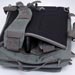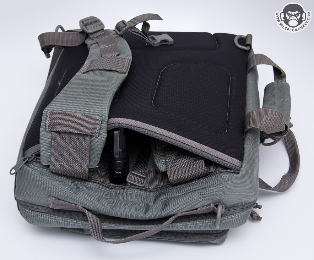Like the description infers, the core bag concept is to be a shoulder bag that can carry an appropriate sized laptop. The Testudo adds a twist to this by having a set of stow-able backpack straps built into the back side. This makes the Testudo a hybrid pack where it can be in shoulder strap mode for quick access or switched over to backpack mode for much more comfort and mobility in longer hauls. It was nice to see the backpack straps were not half-assed either as they are fully padded and even include a sternum strap. When not in use, the backpack straps conveniently hide away in their back pocket keeping a clean look. The Spatha has its own features on the back side including a luggage strap for mounting on rolling bag handles and a single zippered pocket with a generous amount of loop velcro inside for more holding options.