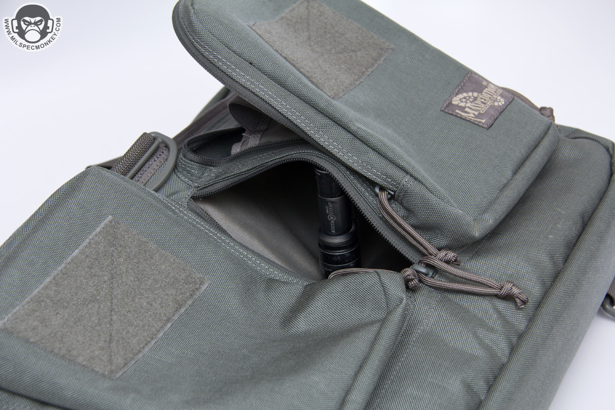 Behind the main frontal pockets is a nice big CCW area that is easy for others to overlook as a pocket and offer another heaping helping of loop velcro space; easily able to hold full sized pistols, magazines, and medium sized flashlights. The opening closes with velcro to prevent accidental interior display with a 2" D-ring incorporated as a pull open point. I have mixed thoughts on the D-ring which Maxpedition has been using for a while. It visually doesn't appear particularly tactical and is likely cost effective, but isn't really that great of a pull since not even all my small monkey fingers can fit inside. Most folks will probably only be able to fit in 2 fingers comfortably so for those who need an easy oh-shit grab I recommended trying out cord or webbing with plastic tubing for rigidity as seen on some pull away pouch designs these days.