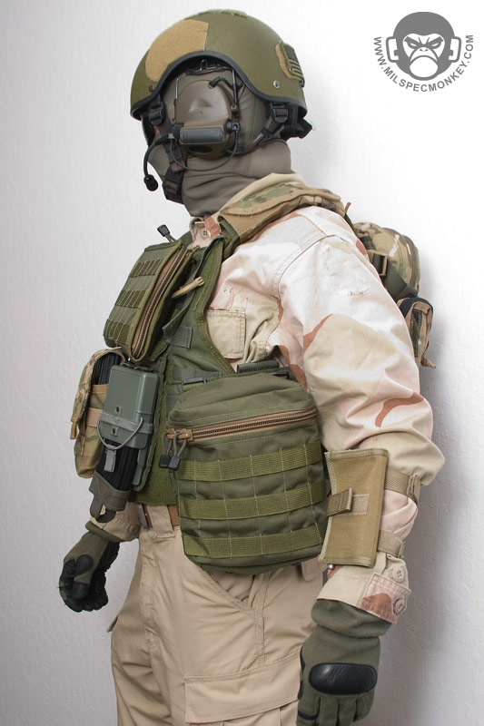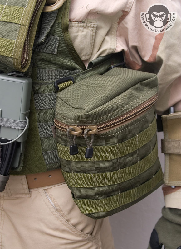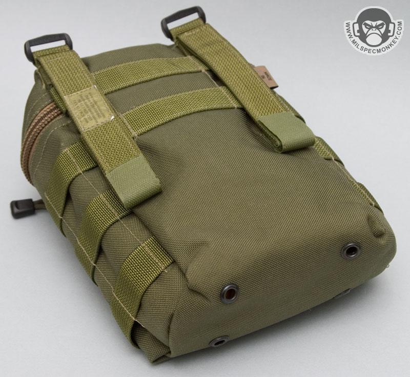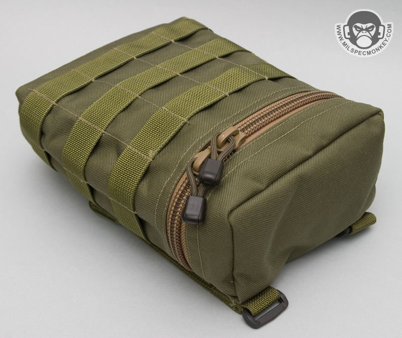 Although originally designed to hold a complete ADF issue ration pack, I find this to be a great general purpose pouch. After seeing the design I'm actually surprised I don't see more like it. The front zip makes this pouch a lot easier to operate when mounted to one's side, which is usually where GP pouches end up. When on the side, the horizontal zipper movement is much more natural than the common top open GP pouches. This design also has more of a rounded rectangle shape with a healthy dose of exterior PALS real estate. The inside is straight forward, with no loops or elastic. Extra plastic slides have been added to the upper back exterior to allow further mounting options.