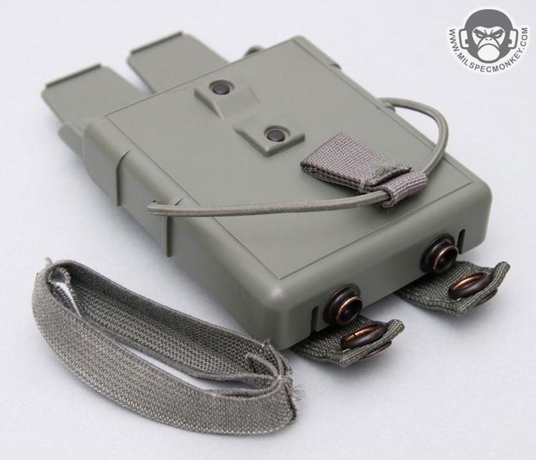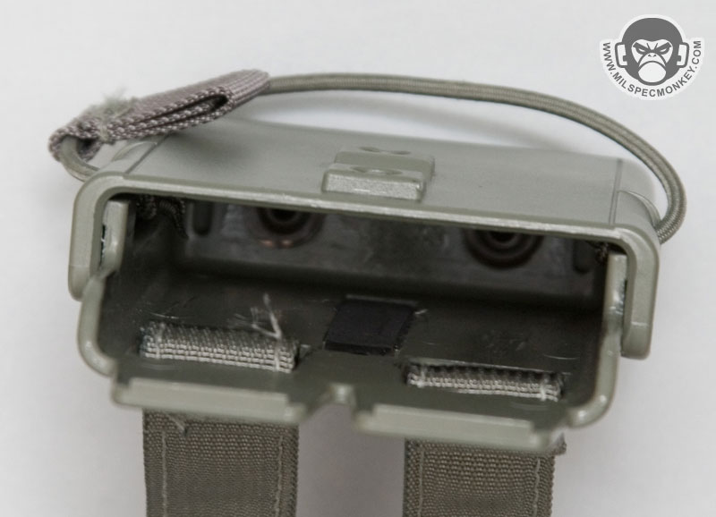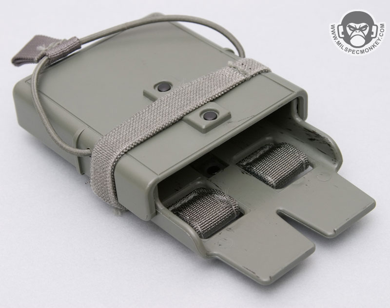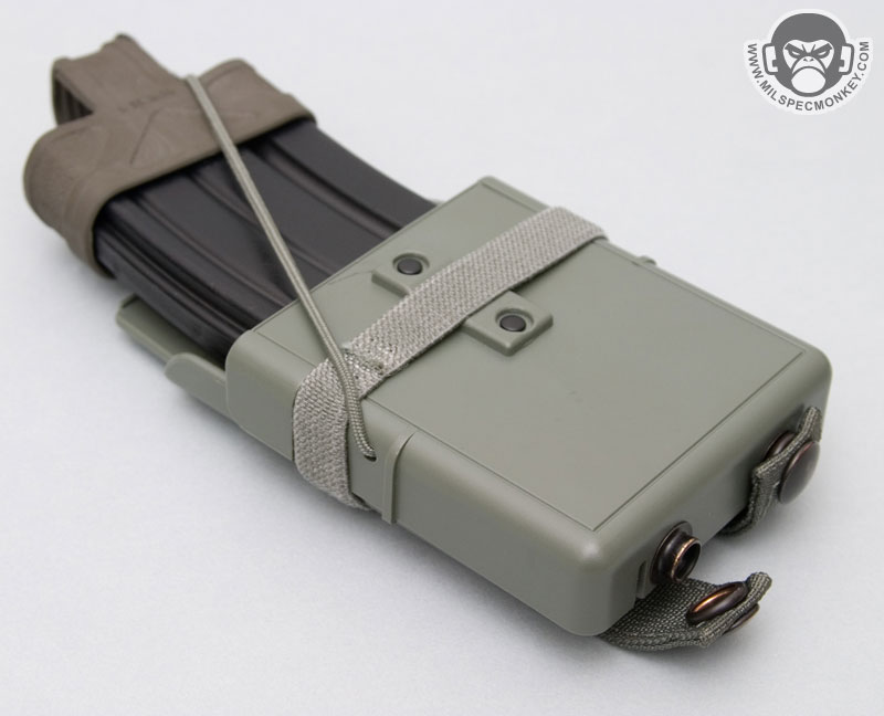 Now the thing that makes the FASTMAG cool to me it that it can be mounted upside-down. The grip is strong enough where one can do plenty of vigorous activities without the magazine inside shifting or falling out. For those who like a little backup or are doing airborne operations, a shock-cord and pull tab "jump" strap is included to further make sure your mag doesn't go anywhere. When the strap is not in use, the back- bottom of the FASTMAG seems to be the optimal place to store it.