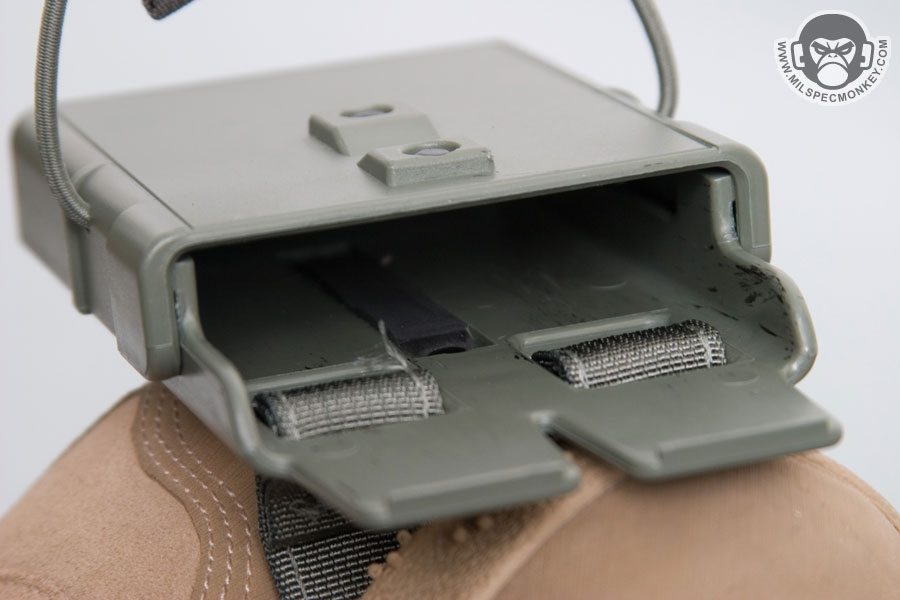 This interesting take on a no flap mag pouch was designed by DownEast Inc. and is being distributed by ITW Military Products. The main idea is to hold 1, 30 round NATO magazine securely with no flaps or straps. The core design is 2 pieces of high-impact resistant polymer that are snapped together at the bottom.