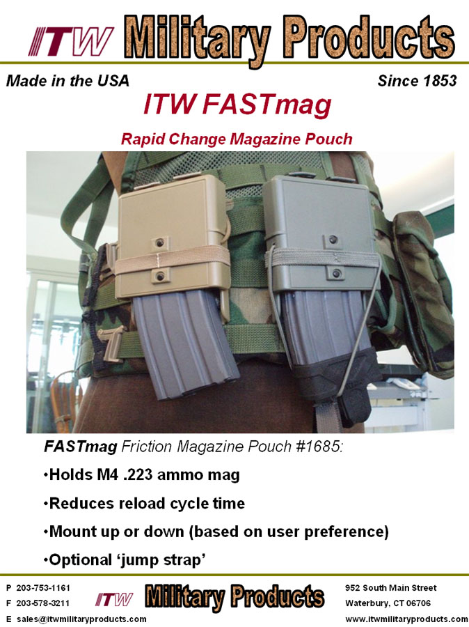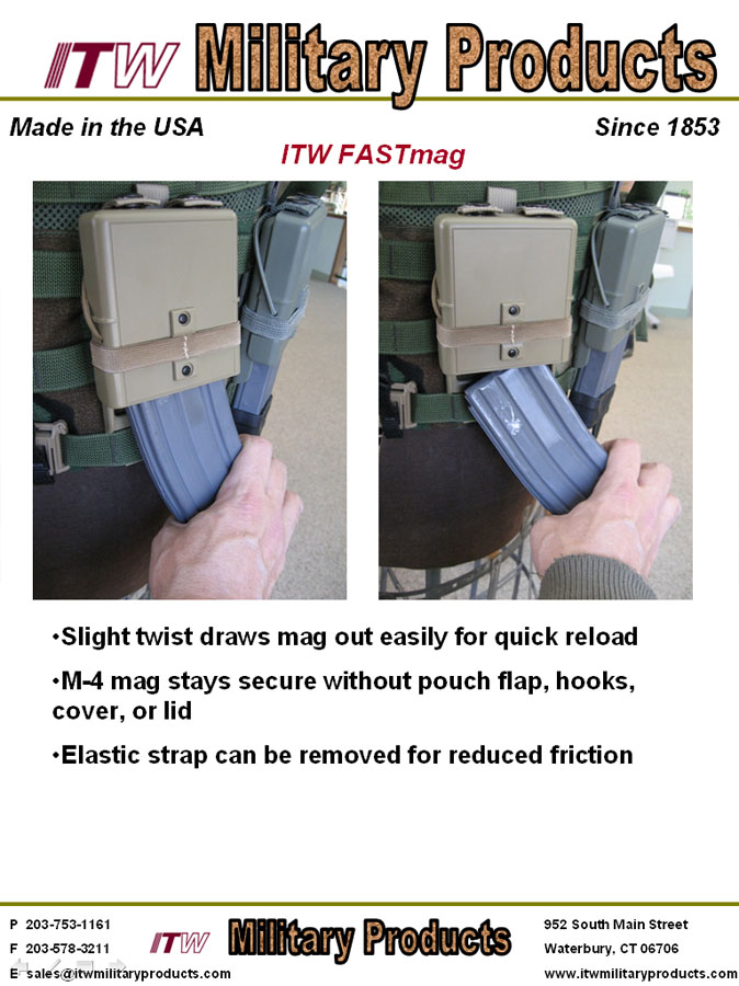 As for the size, the FASTMAG is a little bulky and one can only fit 3 pouches where they could put 4 typical mag pouches. This noted, only 1 or 2 FASTMAGS were intended to be used at one time when designed. As seen practiced by Special Forces units, having an easily accessible magazine amongst the normal pouches can increase battlefield effectiveness. The normal pouches are used for the bulk when behind cover, but when the shit hits the fan, the FASTMAG will give the speed advantage.