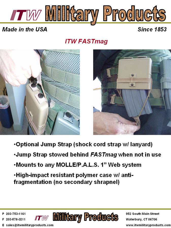 I will keep beating up on mine and keep you folks updated. The design at the moment only works on NATO 30 round magazines and kind of works with 2 double stack pistol magazines. The pistol mags are more of a note that they just happen to fit and are not particularly easy to extract out of the FASTMAG. AK magazines are too thick to fit and M-14 mags are too wide. If I were to change something, it would be having a built in wedge/slant to the back that would slightly push the magazine away from the user's body. This would allow for more hand room and thus an easier grab when using the PAL stabilizer tabs. Be sure and check out my video demo:<FASTMAG DEMO>