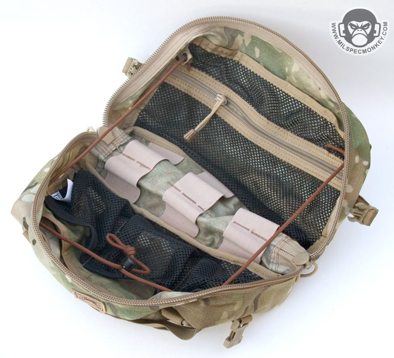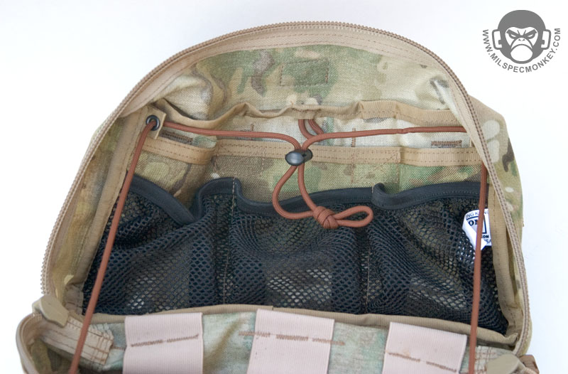 The inside is full featured with zippered mesh pocket, mesh dividers, and additional loose velcro pocket with elastic loops on the bottom. To top it off there is a 550 cord and cordlock setup to adjust the opening angle since the zippers go all the way to allow for 180 degree opening. They are hidden in the pics, but there are also D-rings on the back for further attaching options. Comes with 4 long Malice Clips.