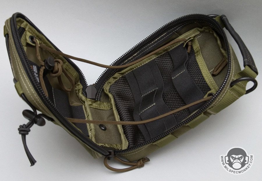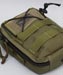 A beefy handle is on top so one can put it in a larger bag, but rip out to deploy easily. D-rings on the upper sides allow extra connection possibilities and the clam shell opening design lets one open up the pouch to get to business quickly. Connection points and a 550 cord/cord lock rig allow the user to set the opening angle which is helpful when mounted to kit. If you are not into that it can easily be removed and replaced later if desired. The inside includes well placed large elastic loops to hold your goods and a mesh sleeve on one side with a zippered pocket on the other for even more options. Moving back to the exterior, the PALS webbing on the front and back are wide non-spec to allow an easier time of sliding in common tools such as medical shears. The front also has a shockcord rig for holding extra items which is ontop of a horizontal sleeve "cave" for holding tools such as flashlights. This area also has velcro for your ID patches. As a nice touch the sides have webbing for further connection / holder points. Currently available in Black, Green, Khaki, and ACU.