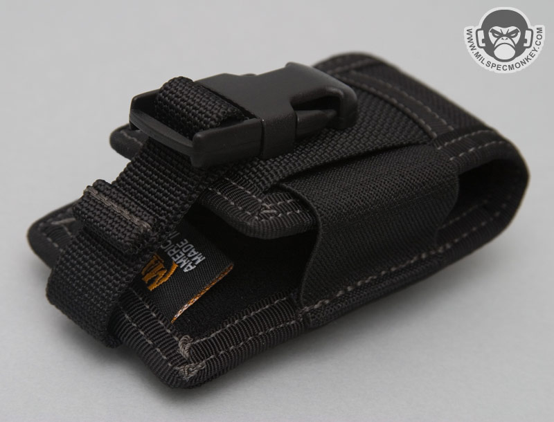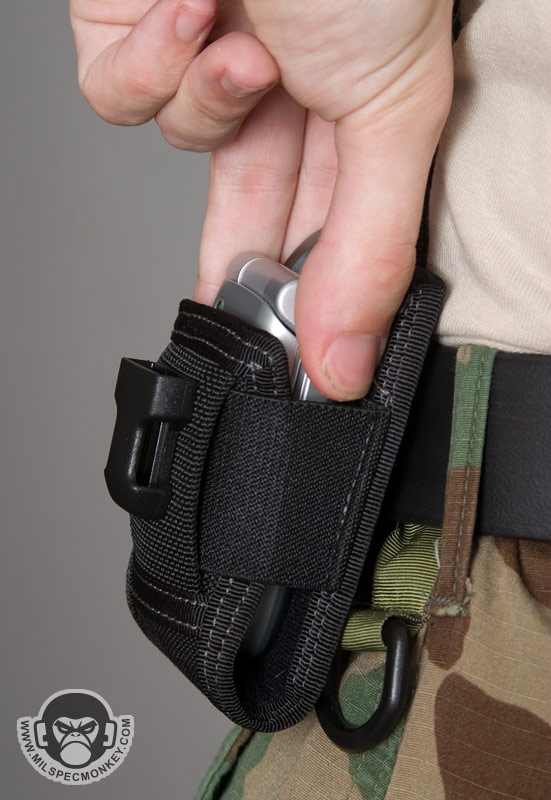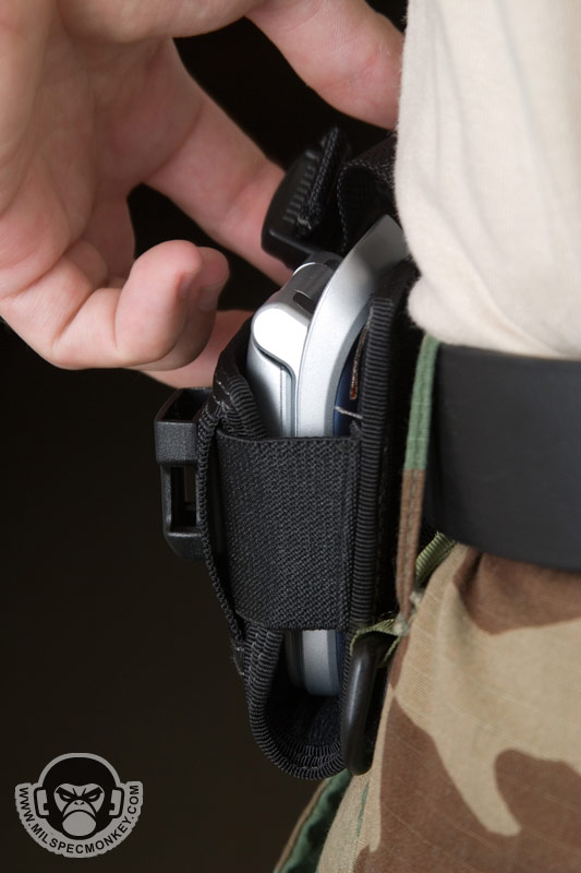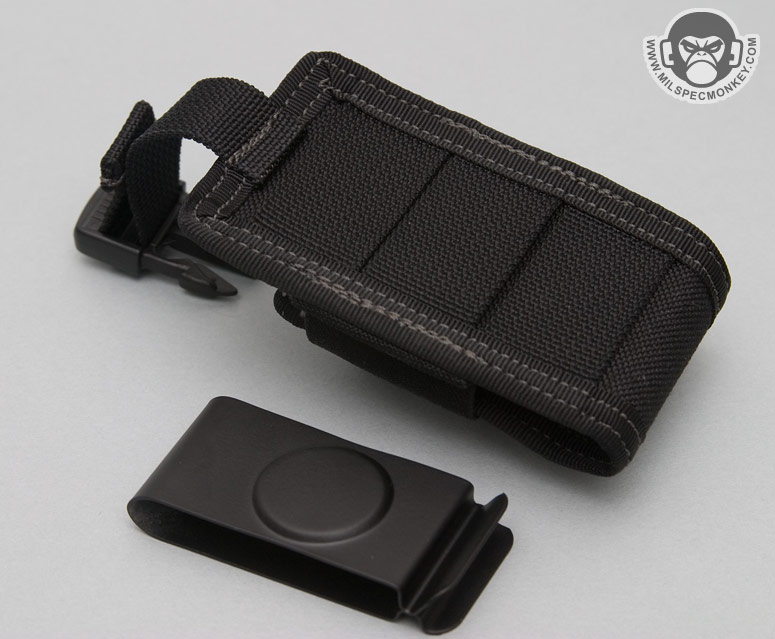 The inside is lined with soft goodness to play nice with your phone and won't scratch it up. The elastic sides work well for adjustability and hold, but also don't smash in buttons on the sides of most phones. The female part of the SRB is mounted directly on the holster so you only have to worry about the male strap when connecting and releasing. I wish there was a clever way to get the holder strap out of the way when releasing one's phone, but I find knocking it away to the side is not too bad. The holster comes with a beefy heavy duty spring steel clip that has a jet black power coat and can accommodate up to 2.25" belt loop. This clip has a great grip, but if you would like different mounting options, you can easily take it off and use the PALS webbing. A short Malice clip (sold separately) fits in there nicely or if you want to get a little wacky, one could thread a thin belt through there for a horizontal holster mount. Currently only available in Black and pictures show a Sony Z525a phone as a demo piece.