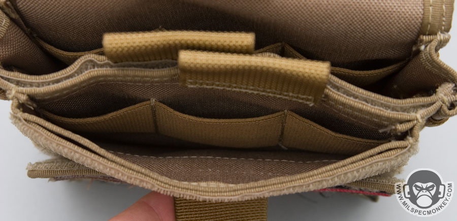 Core functionality begins with the main flap. The outside is covered with loop velcro for your patch / ID needs. The inside of the flap has a good panel of hook to allow the flap to accommodate the pouch when empty or full. The flap itself has a sleeve pocket that goes down the back of the main pocket. It works well for additional out-of-the-way organization of slim items. The main pocket has 1.5" depth and has elastic on the front and back sides with 3 divisions each. The user can fill these out or use the preferred side. The elastic division spacing works great for pistol magazines, chem lights, flashlights, multitools, and more. The pocket itself can hold many diverse items such as 2, 30 round NATO magazines vertically, gloves, GPS units, handcuffs, pens + small notebooks, the list just goes on. A grommet is included for drainage.