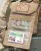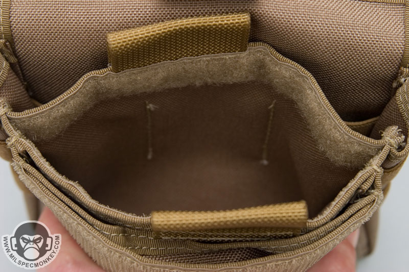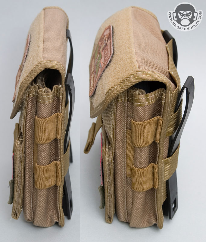 Another feature setting the Monkey Combat Pouch apart from the rest is the unique ID flap. Although at first glance, one may want to pull up on the pull tab, the tab is pulled down to open. A clear vinyl sleeve with anti-glare texture allows placement for 2 IDs, a mini map, ballistic sheet, HVT pictures, or whatever slim item one wants to put in there. The folding of the pocket naturally makes 2 divisions, but there is only one opening to deal with. When the flap is closed, the goods are velcro sealed securely inside. This allows the user to quickly flash their ID or view intel when needed, then go back to business being fully concealed. The way the ID flap is stitched to the pouch creates a cave area where items can be stored. A flashlight, beatstick, or knife fit in here well for quick access, but low security. Alternatively slim paper documents can be hidden inside as well.
