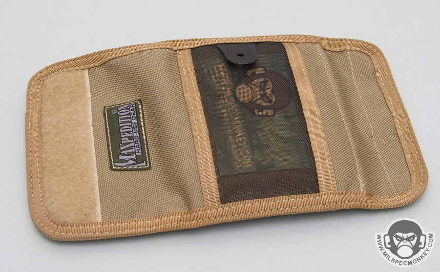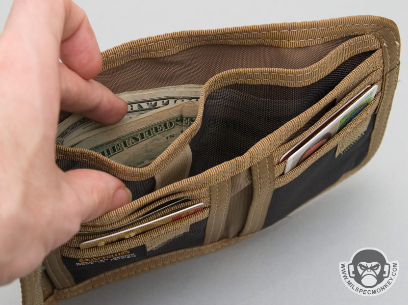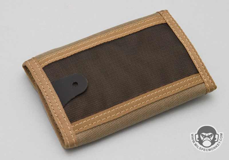 Those who carry multiple currencies or organize their money will find this useful. Those with smaller pockets will not. The rest of the interior is a business card / CC card party with a long horizontal pocket that could be used as a 3rd money pocket. Velcro flaps are included to secure one's cards and such, but I find these to be a total pain in my ass. To get to a card I have to open the velcro flap, use my card, then re-open the velcro flap to put the card back in since the flap fell back down. Luckily these flaps can be cut-off without issue or tucked into slot pockets of the wallet. Odly an ID area is lacking, I would have liked one to be there. The exterior has a slot pocket with mesh that is longer than usual so has multipurpose abilities. A hypalon tab is also attached here to serve as a connection point; good for a keychain or lanyard. The Spartan makes for a mean card and money organizer, however it would be a lot more practical for me with some sort of ID carrying area. The exterior pocket is mesh, but not see-through enough for ID display. Whoever is viewing it will make you take it out to show them guaranteed.