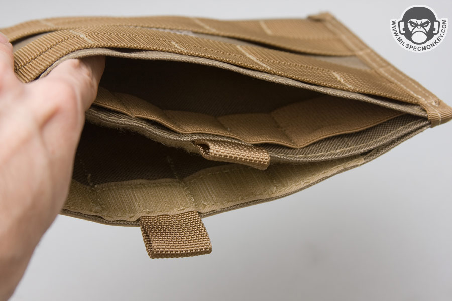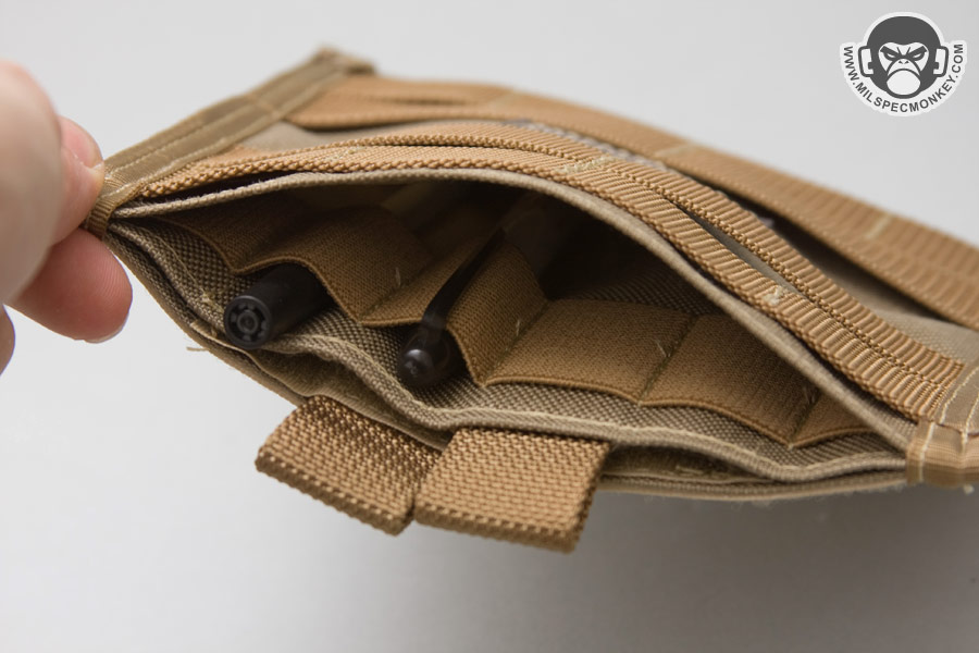 Just in case you like to mix things up a bit, the exterior has PALS webbing so one can add that extra pouches as needed. The 6" height on both versions line up with the PALS well and gives enough room to fit most pens. Although the Haffafug can hold a small notebook, the user can carry larger media like maps easier in the Fugly. On both there is a velcro sealed sleeve pocket which has pull tabs to assist in opening. Behind that is an open sleeve that has elastic loops inside to easily hold an assortment of writing tools or chem-lights. The Fugly has wider elastic divisions on the ends that can hold larger items like folding knives and flashlights. As a result you have a sealed pocket for important small stuff and have your open pocket for quick grab items so you don't have to open any flaps for frequent use items. The back PALS are sewn a little different in which the central rows have less divisions. Most people will use 2 long Malice clips to attach to their kit, but you can use more if desired. Although most people will use the Fugs chest mounted on vests, they can also work great on packs. You not only get a patch panel, but a little organizer as well. I can see the Fugly working particularly well on Law Enforcement vests to allow large ID patches, yet while still keeping the exterior PALS option. As a note, for small guys like me the Fugly is a bit wide when chest mounted coming in at 9". It likely will work for big boys fine, but works great for all sized folks when back mounted. I highly recommend the Fugly and Haffafug for those who want a patch panel with some extra sass or super slim admin pouch.