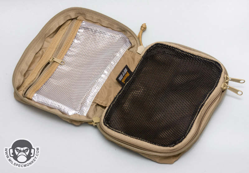 In the front is a mesh zippered pocket allowing ease of visibility and accessibility. The back has a good strip of PALS ready to take 3" TacTies or short Malice Clips. One can get away with 2, or go up to 4 for a more firm attachment. The main opening is a double zipper clamshell design to allow full access to the interior. One side has a partial see-through single zippered pocket while the other side has another clamshell double zipper opening mesh pocket. This allows some options for items depending on if they need to be air'd out or more protected. Although not a big med pouch it is large enough to hold medical basics such as shears or a full size tourniquet. Since not a tear away design I see it as more of a boo-boo pouch when mounted onto gear or placed inside larger packs. A bonus webbing handle is on the bottom for such usage. During less tactical moments it works great as a travel pouch with toiletries inside. As a small suggestion, would have been nice to see some elastic webbing in the interior. When zipping up the main compartment, sometimes the interior mesh pocket zippers stick out, luckily this is not a huge stoppage issue. For those who don't need something all high speed, this is a great lightweight pouch that can be well stuffed full of goodies.