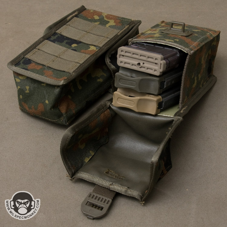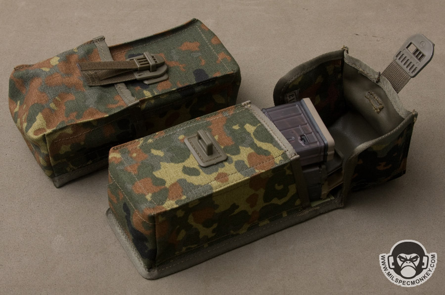 For those into simple designs this is a regulation style mag pouch for ze Germans. The connection points of two G36 mags require the need for all of the 3 inches of depth you see in this pouch. NATO mag users can take advantage of this aspect and can ram in 3 magazines easy. To keep out debris the flap is a full cover style which is nice for protection. The front and back sides of the interior have plastic stiffener to keep proper shape and add durability. To mount, the back has PALS webbing setup to interface with long MALICE clips. Making it unique to most of us SRB whores, the main security hardware is a "Spanish" style clip. It is hard to explain so be sure and view the pics. The Spanish style works quite well as a quick release only requiring one motion of pulling the webbing slack. The down side would be the Spanish style isn't as easy as other methods to resecure. No elastic is on the sides, so keep this in mind when placing 2 NATO mags inside that won't fully fill the pouch. All the materials are mil spec making this pouch feel nice and heavy duty.