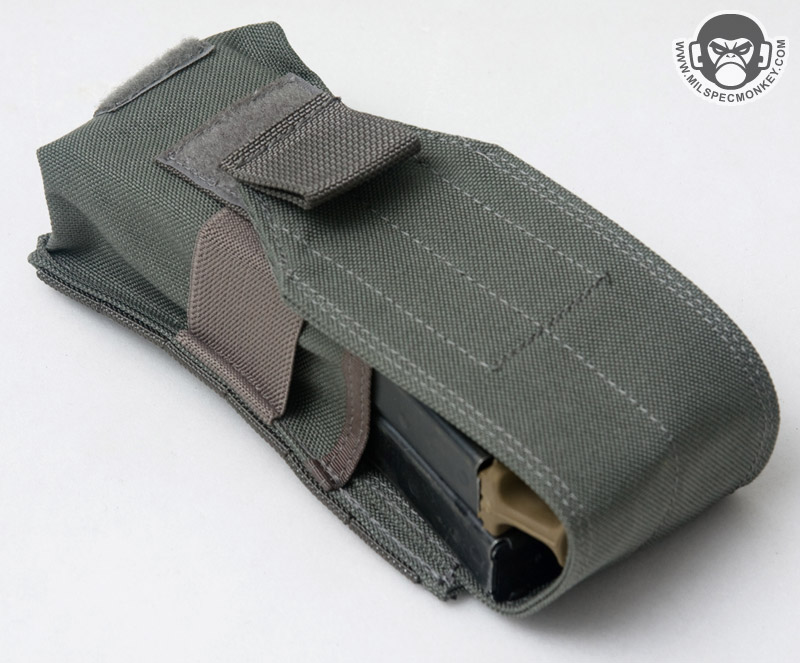 The pull tabs point up as a nice touch giving an easy pull. There is even loop velcro on the interior back to keep the flap in folded mode, however the height is fairly low on this being covered when a magazine is inside. I wish the loop velcro was extended much higher up to make speedy flap folds possible. A grommet is on the bottom standard for drainage and the back has a full set of PALS for 5" Tac Ties or similar mounting accessories. Available in both single and double pouch configurations.
