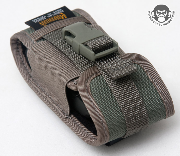 A beefy heavy duty spring steel clip is included that has a jet black power coat and can accommodate up to 2.25" belt loop. This clip has a great grip, but if you would like different mounting options, you can easily take it off and use the PALS webbing. A 3" Tac Tie (sold separately) fits in there nicely or if you want to get a little wacky, one could thread a thin belt through there for a horizontal holster mount.