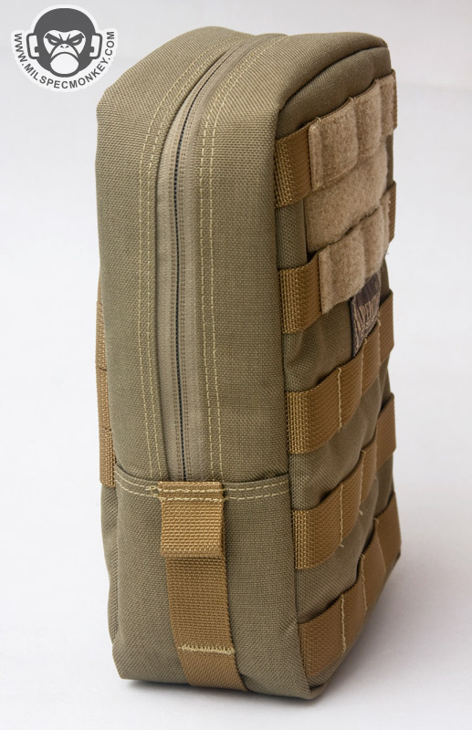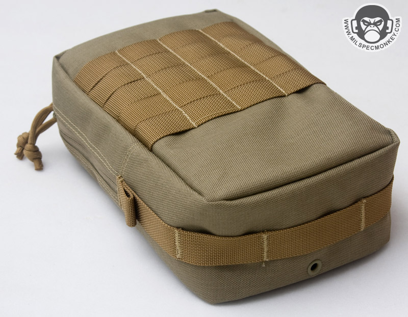 They go down about two thirds the way to create a good sized opening and webbing tabs are also on the end for zipper pull points or attach points. The webbing for these tabs travels along the bottom with an offset drainage gromet to allow extra lashing options. I'm not sure of the design intent, but there is loop velcro in the interior bottom of each pouch. The front has 5 channels of PALS (9" tall) With a good dose of loop velcro for your favorite patch. The back has a full set of PALS for the most mounting options. 5" Tac Ties or similar are recommended for mounting. Since it is a tall pouch, they hang down from the attachment point, however this adds some flexibility when mounted to a body. There aren't a lot of MIL padded pouches these days so this 6x9 one makes for a solid option.