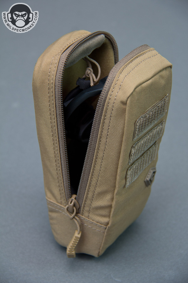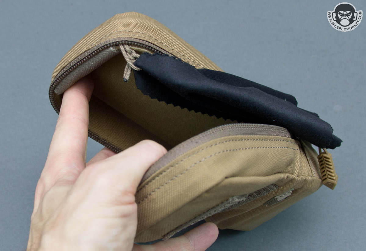 TACTIX SERIES EYEWEAR POUCH: Hence the name made to hold eyewear, instead of the HD style foam it includes a much more rigid sleeve for crush protection and a tethered microfiber cloth. It will hold full size shooter glasses, yet I wish the zipper went down just a little further to allow a larger opening to make removing eyewear easier. First Tactical did however have design intent where one can just keep the pouch open and there would be enough retention to hold eyewear in for users going in and out of different lighting situations frequently.