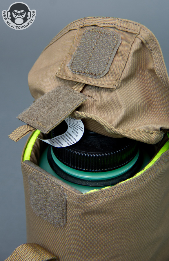 TACTIX SERIES BOTTLE POUCH – 1.0 LITER: It can hold a good variety of personal hydration bottles especially with modular padding factor. As a nice touch there is an SRB buckle closure for high retention and a hook and loop closure for a faster "on the fly" option. Thinking of the small details there is an interior loop piece to cancel out the hook when not wanting to use that closure mode. The cancel pad even has its own sleeve for storage. When not using the foam sleeve, there is an additional loop piece on the back to allow the whole pouch to be rolled up compactly while still mounted. I'm a little torn to see how little of connection space this pouch gets compared to the 6x10 pouch, but it seems a clear design choice to offer the fold up feature. I'd also like to see the lid a little larger as it can be pretty hard to get a good closure when in a hurry. The current semi-tight lid doesn't give much error tolerance for a proper closure covering the upper sides.