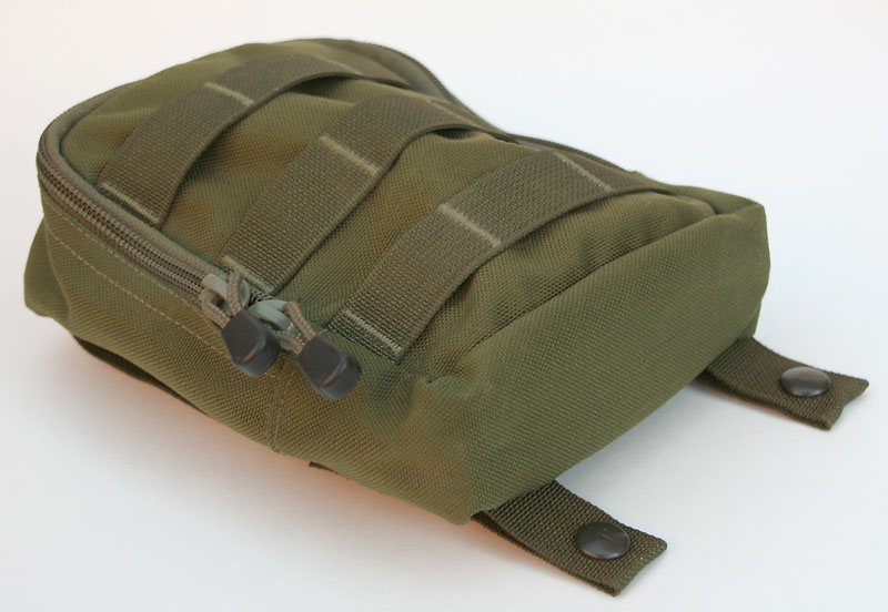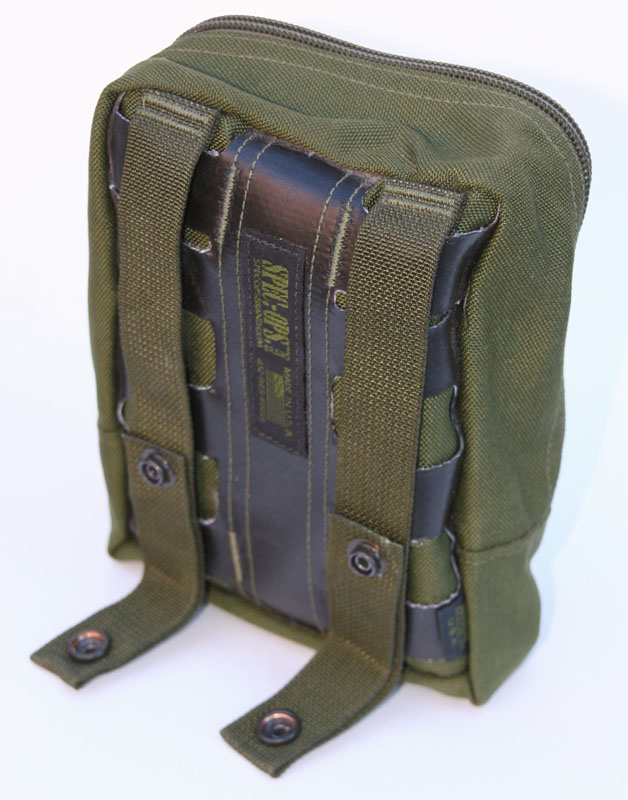 Notes: Unique medium pouch for a good batch of ADMIN gear such as GPS. pens, batts, papers, lights, etc. I dig the flap down ability and bonus lanyard clip. Back webbing is some sort of ballistic material to make easier PALS weaving. Uses classic MOLLE style snaps, but are positioned where they end up under the PALS of what you are mounting on; making them a lot harder to get on and off than I'd like. However, once on, they sure as hell aren't coming off on accident.