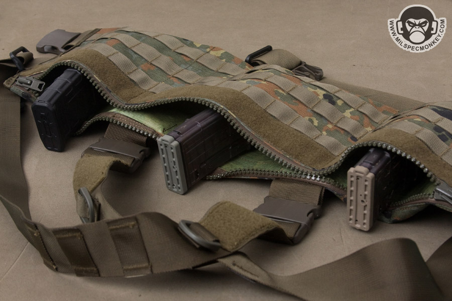 Some other unique features include a generous piece of loop velcro on the upper portion, shoulder straps, and a little piece on the back. The shoulder straps also have D-rings and PALS webbing for further mounting and routing options. As a small con the main should straps are sewn to the rest of the rig with multiple straight stitches rather than a box stitch which would be preferred just in case the rig needs to be drag-man capable. To give further holding options, the whole top front is a zipper pocket with beefy YKK zippers. The inside is sewn to create 3 sections which is nice organization wise and to not let the rig get too floppy when unzipped. All the main straps have SRBs to make taking on and off easier. The waist strap however only has 1 SRB on the left side (while wearing). All materials used are heavy duty and mil-spec making this unit battle ready. Great for use as a lightweight rig worn over clothes or to give easier on / off capability when worn on top of armored vests.