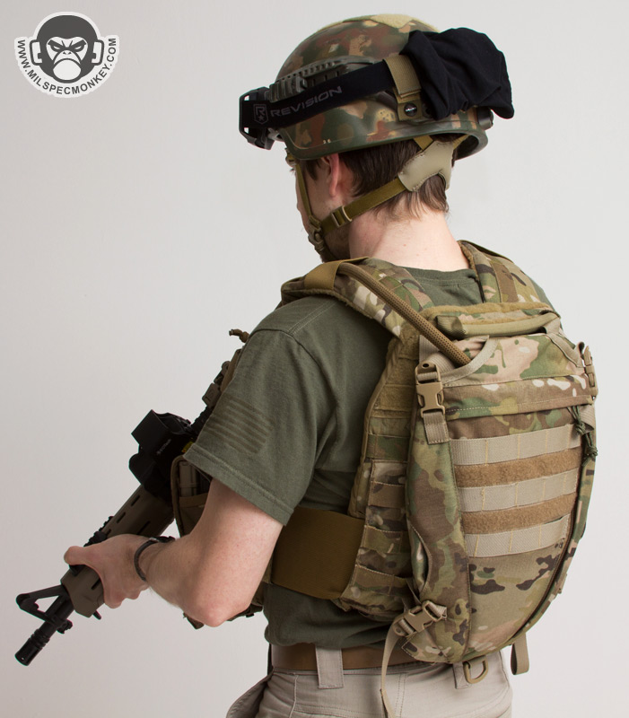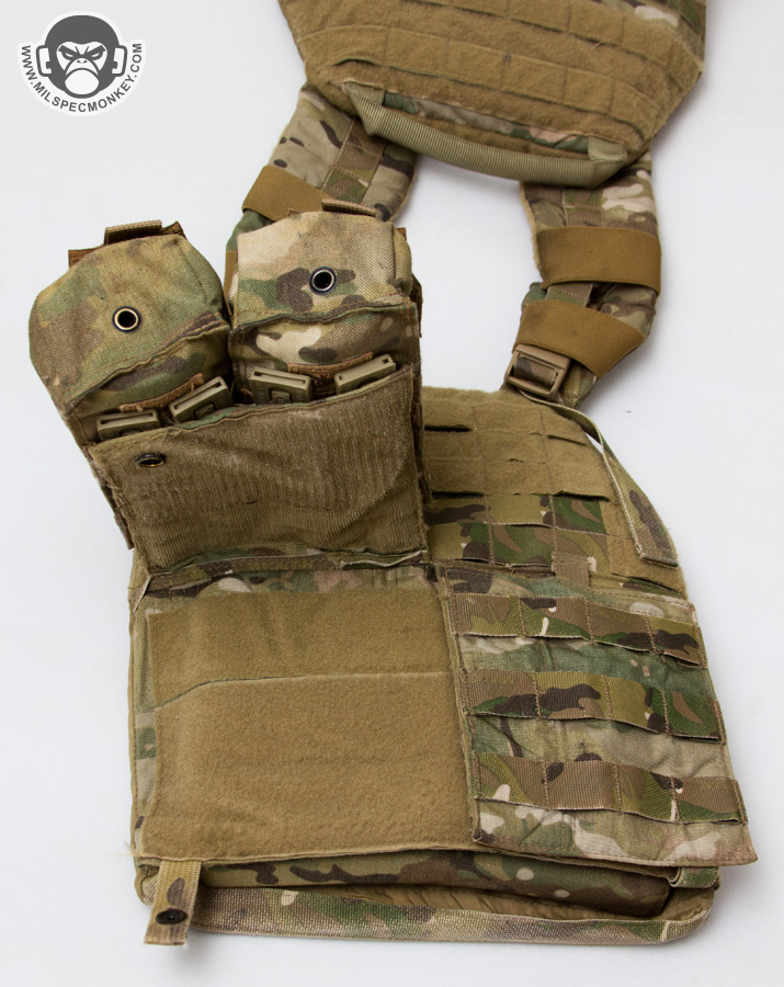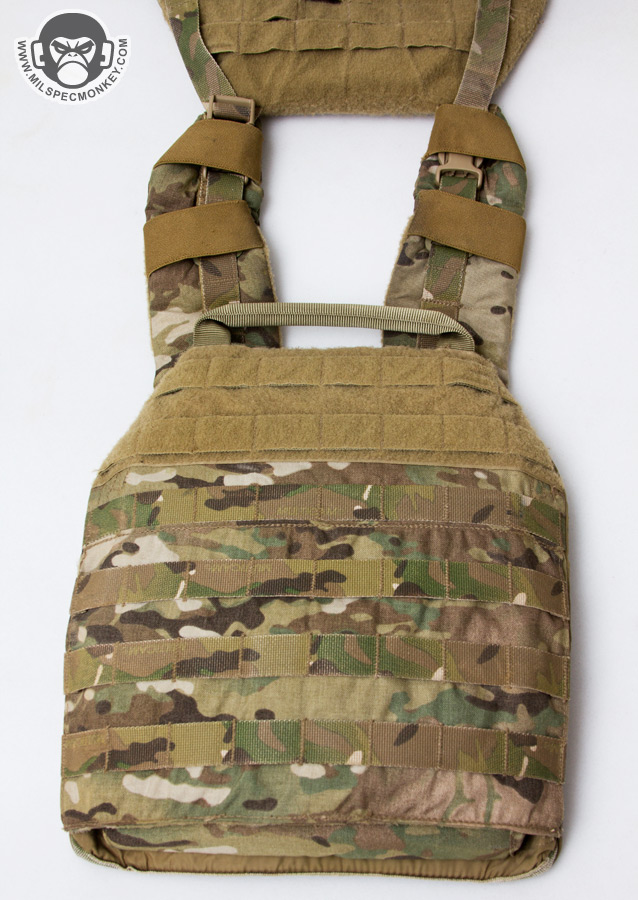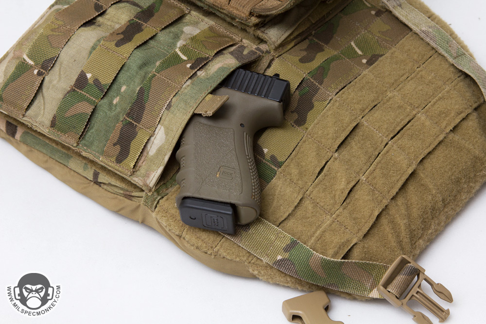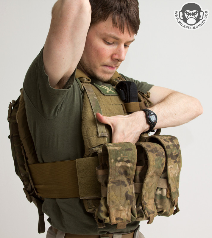 Getting the PIG on and off is easier than most carriers due to the accessible shoulder SRBs and split front panel. Due to this, the user can just release one shoulder buckle and one cummerbund side to easily get out, not taking too much longer than a quick release system. For the side straps an elastic based and PALS cummerbund are available. The elastic one being simple and lightweight for those who want simplicity and the PALS cummerbund for those who want more mounting options. Since my monkey ass is so small, I was only able to get the elastic cummerbund to fit as tight as desired due to cheating the back connection tight with overlap. The PALS cummerbund is somewhat big and uses shock-cord to connect so I wasn't able to get it tight enough. As a work around one can use shock-cord to tie the PALS of the sides to the PALS of the back panel. This can take some trial and error on what cord thickness to use and how many times to wrap to get the balance of a good fit with some elastic give for breathing. The PALS cummerbund on its own doesn't have any stiffener which makes it flexible and generally lightweight, however will sag a little if heavy equipment is mounted. Not to be forgotten, pocket addons are available for 6"x 6" side plates as well as 6"x 8" & 7" x 8" models for both elastic and PALS cummerbunds. Using a nice combo of elastic, stiffened back, and adjustable webbing loops, the pockets allow one to mount a side plate, or both a side plate and a soft armor backer behind it without a bunch of flopping around.